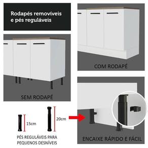 Além disso, os pés reguláveis em PVC garantem estabilidade e nivelamento, adaptando-se facilmente a diferentes pisos, e o rodapé em MDP é removível para facilitar a limpeza do ambiente.