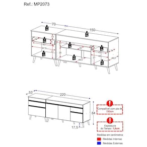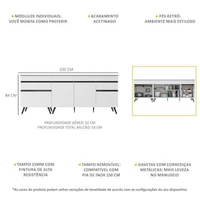 Dimensões do produto montado: Altura: 84cm | Largura: 220cm | Profundidade: 53cm (balcão com tampo) *Você pode consultar as medidas internas na imagem técnica do produto.