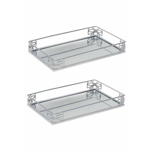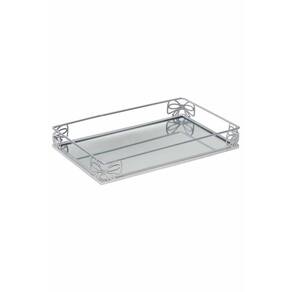 Linda bandeja decorativa feita em metal com espelho no fundo e desenho de laço na lateral com pintura fosca.