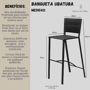 Estrutura em Alumínio, pintura Epóxi eletrostática, revestida em fibra sintética de altíssima qualidade ( COEX ), proporcionando versatilidade e liberdade para ser usada em ambientes internos ou externos, área gourmet, área de lazer com piscina, cozinhas, bancadas, bistrôs, padarias, cafés, lanchonetes, restaurantes, hotéis, etc.