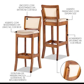 Se você está procurando uma banqueta que se destaque em todos os ambientes, precisa conhecer a Banqueta Portugal. Com um design moderno, ela vai se adequar perfeitamente as suas necessidades do dia a dia. A Banqueta Portugal é perfeita para ser utilizada em diversos espaços, como a bancada da cozinha americana, balcões altos em espaços gourmet, mesas bistrô no cantinho do churrasco e muito mais. Ela traz estilo e funcionalidade para qualquer ambiente em que for colocada. Produzida com materiais de excelente qualidade, a Banqueta Portugal garante maior durabilidade e resistência. Não perca mais tempo procurando a banqueta perfeita e venha conhecer nosso catálogo para deixar sua casa mais completa e cheia de estilo com todos os produtos da Rio Madeira Interiores. CARACTERÍSTICAS TÉCNICAS: - Produzido em Madeira Maciça Sustentável - Acabamento em Verniz na cor Imbuia - Encosto com Revestimento em Rattan com Fibra Sintética Quadriculada na cor Bege - Assento Estofado Preenchido com Espuma D23 - Assento com Revestimento em Linho Bege M58 - Banqueta Entregue Montada *Kit Composto por DUAS Banquetas INFORMAÇÕES TÉCNICAS: Altura Total: 100 cm Altura Chão até Assento: 75 cm Altura Encosto: 29 cm Largura Total: 35,5 cm Largura do Assento: 41 cm Profundidade Total: 45,5 cm Profundidade Assento: 35 cm Peso: 7 kg INFORMAÇÕES ADICIONAIS: Garantia para defeitos de fabricação conforme Código de Defesa do Consumidor. - Produto em madeira maciça natural, podendo ocorrer variação no tom ou cor da madeira. - As imagens ambientadas são meramente ilustrativas e podem apresentar itens que não compõe o produto, as cores do produto podem variar de acordo com o monitor, a iluminação do ambiente ou sua percepção visual. - Limpeza: Deve ser feita com pano macio e seco ou levemente umedecido com água e sabão neutro. Não devem ser utilizados abrasivos.