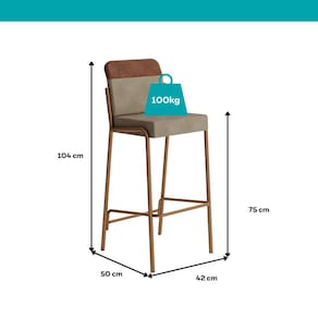 Especificações Banqueta: Medidas: Largura: 42 cm | Altura: 104 cm | Profundidade: 50 cm Altura até o assento: 75 cm Peso: 12,60 Kg Estrutura: Tubos de aço Assento: Estofado Encosto: Estofado Montagem: Soldada Ponteira: Plástica Peso suportado: Até 100 Kg