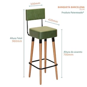 A banqueta Barcelona, possui 04 pés de madeira eucalipto com 60 cm de altura, e encosto estruturado, com seu design moderno, pode ser utilizada em sua área gourmet, área externa.