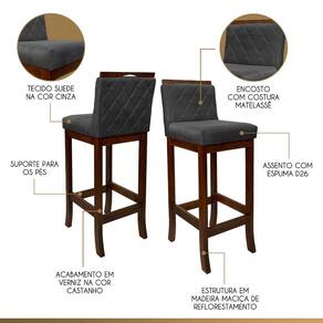Apresentamos a banqueta Nice, feita com madeira maciça de reflorestamento e acabamento em verniz. Seu assento preenchido com espuma D26 e encosto com espuma D23 garantem conforto duradouro. O encanto adicional vem da costura matelassê no encosto, enquanto o revestimento em suede adiciona uma sensação de luxo. Adapta-se perfeitamente a qualquer espaço, adicionando elegância e conforto instantaneamente. CARACTERÍTICAS TÉCNICAS: - Produzido em Madeira Maciça de Reflorestamento; - Acabamento em Verniz na cor Castanho; - Assento Preenchido com Espuma D26; - Encosto Preenchido com Espuma D23; - Encosto com Costura Matelassê; - Revestimento em Suede na cor Cinza. *Indicada para Bancadas/Mesas com Alt. 90/95 cm. *PRODUTO ENVIADO MONTADO. INFORMAÇÕES TÉCNICAS: Altura Total: 92 cm Altura até Assento: 65 cm Altura até Travessa: 13 cm Altura Encosto: 35 cm Largura Assento: 38 cm Largura Estrutura: 36 cm Profundidade Total: 42 cm Profundidade Assento: 41 cm Peso: 7 kg *Kit Composto por 2 Banquetas Nice. INFORMAÇÕES ADICIONAIS:ATENÇÃO: Móvel produzido em madeira maciça natural podendo ocorrer mudança no tom da madeira conforme o produto;*Conferir se o produto está de acordo com o que comprou, produto danificado não será aceito troca;**As imagens ambientadas são meramente ilustrativas e podem apresentar itens que não compõe o produto. As cores do produto podem variar de acordo com o monitor, a iluminação do ambiente ou sua percepção visual;***Limpeza deve ser feita com pano macio e seco ou levemente umedecido com água e sabão neutro. Não devem ser utilizados abrasivos como palha de aço e objetos cortantes;Garantia para defeitos de fabricação conforme Código de Defesa do Consumidor. Marca: CCS Interiores