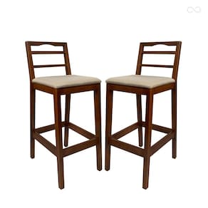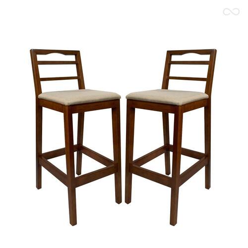 CARACTERÍTICAS TÉCNICAS: - Produzido em Madeira Maciça; - Acabamento em Verniz na cor Castanho; - Assento Preenchido com Espuma D26; - Encosto Ripado; - Revestimento em Linho na cor Bege. *Indicada para Bancadas/Mesas com Alt. 100/105cm.