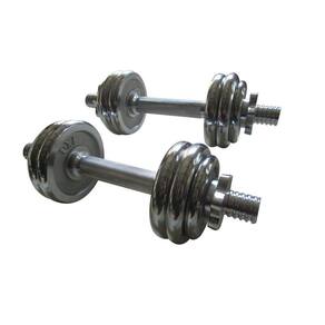 Com o "Kit 2 Barras com Anilhas, Cromado 15kgs" é possível montar halteres com diferentes cargas, sendo ideal para trabalhar os membros superiores com vários tipos de treino.