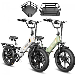 O kit Jasion X-Hunter ST reúne duas bicicletas elétricas dobráveis para adultos, nas cores branca e verde, ambas com quadro step-through em alumínio, pneus 20 x 4 e suspensão dupla, indicadas para uso urbano, trilhas leves e diferentes tipos de terreno. Cada bicicleta combina estrutura dobrável, assento e guidão ajustáveis e racks/cestos dianteiro e traseiro para facilitar o transporte de bagagens e compras.