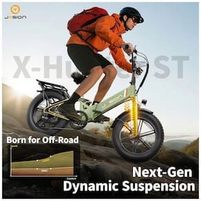 Recursos adicionais: Pneus 20 x 4 resistentes a furos, quadro dobrável, suspensão dupla, cestos dianteiro e traseiro, farol, luzes de seta e freio, selim ergonômico, guidão ajustável