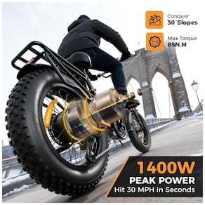 Motor: Hub traseiro brushless, pico até 1400W, torque aproximado 85Nm