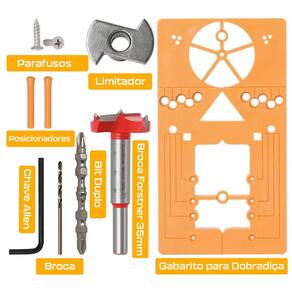 Kit Gabarito com 2 Fresas Broca Forstner 35mm para Dobradiça Caneco com Limitador de Profundidade Completo - Marca: Dremax - Kit com 2 Brocas Forstner e Gabarito para instalação de dobradiças tipo caneco 35mm - Gabarito com escalas claras e precisas, para furação na posição correta - Kit Ideal para instalar dobradiças e outros encaixes em madeiras duras, aglomerados no segmento de móveis e carpintaria - Fresa com dente de vídea/metal duro indicada para trabalhos em madeira e derivados na colocação de dobradiças tipo caneco - Diâmetro do corte: 35mm - Haste diâmetro x comprimento :8 mm x 20 mm / 12 mm x 25 mm - : 90 dias contra defeitos de fabricação Itens inclusos: - 2 Fresas dobradiça tipo caneco 35 mm com 3 dentes - 1 Gabarito para dobradiças caneco - 1 Chave Allen - 1 Limitador de profundidade - 1 Bit ponta dupla - 1 Broca - 2 Parafusos - 2 Haste de posicionamento Marca: Não Informado