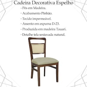 Kit 2 Cadeira Decorativa Ivory Tela Natural Pés Madeira Pinhão, traz o conforto que você merece, levando muito mais harmonia e leveza para seus espaços. Estrutura produzida com madeira de tauari proporcionando maior durabilidade e resistência à peça. Compostas por pés em madeira com acabamento em pinhão, encosto com detalhe em tela sextavada na cor natural, assento com tecido impermeável em espuma D-23. Suportando até 120 kg cada. Possui design inovador, proporcionando graciosidade e elegância em seus ambientes, ideal para compor sua sala de jantar, sala de estar e cozinha. Este móvel chegará em sua casa separado em 02 volumes.