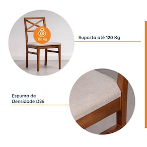 A cadeira Primavera CabeCasa MadeiraMadeira, tem sua estrutura fabricada com 100% de madeira maciça reflorestada. Tem como essência a robustez, seu assento é estofado, com revestimento em linho, enchimento com espuma D26 macia, possui uma estrutura resistente, suportando até 120Kg. Combina com diversos ambientes. Acabamento da Estrutura: PU Almofada do assento: Fixa Altura do assento até o chão: 48 cm Ambiente Principal: Sala de Jantar Cor: Marrom Cor do Produto: Marrom Dobrável: Não Enchimento do Assento: Espuma D-26 Escala de Brilho: Semi-Brilho Estrutura do Assento: MDF Estrutura do Encosto: Madeira maciça Giratória: Não Itens Inclusos: 2 Cadeiras, kit de ferragens e manual de montagem Linha ou Coleção: Primavera Manual de Montagem e Instalação: https://cdn2.madeiramadeira.com.br/prd/artemobili/1070838-CADEIRAPRIMAVERA.pdf Material da Base: Madeira maciça Necessita Montagem: Não Origem do Produto: Nacional Peso: 7 kg Possui Apoio para Braços: Não Possui Apoio Para os Pés: Não Possui Rodízio: Não Recomendações de Uso, Manutenção e Limpeza: Limpeza com um pano umedecido Revestimento do Assento: Linho bege rústico Tipo de Assento: Fixo Tipo de Encosto: Fixo Tipo de Madeira Maciça: Pinus
