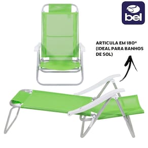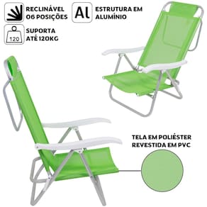 A Cadeira de Praia Reclinável Sunny Bel é um item indispensável para quem adora sol e praia. Desenvolvida com assento mais largo e encosto mais alto, esse modelo proporciona mais conforto e resistência para quem usa. A tela é confeccionada em 100% poliéster com revestimento em PVC e sua estrutura é em alumínio, com tubos mais largos. A Cadeira de Praia Reclinável Sunny Bel suporta um peso de 120kg e reclina até 180º, sendo ideal para descansar, relaxar e tomar sol. Com um design funcional, a cadeira é dobrável e leve, facilitando seu transporte por onde for.