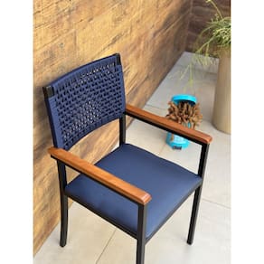O assento estofado em material sintético de alta qualidade, na cor azul marinho, é fácil de limpar e proporciona um toque de sofisticação. O encosto trançado em corda náutica confere um charme artesanal, além de garantir conforto ergonômico e excelente ventilação. Os braços em madeira natural adicionam um contraste acolhedor e refinado ao conjunto, destacando o equilíbrio entre o estilo rústico e o contemporâneo.
