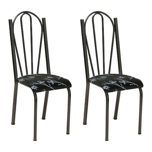 Kit 2 Cadeiras De Cozinha Alasca Estampado Preto Florido Pés De Ferro Cromo Preto - Pallazio