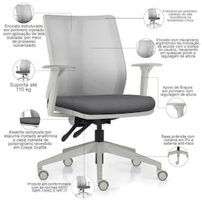 Color: CinzaGrafite | ColorFamily: Cinza | ColorSimple: Cinza | ColorSupplier: CinzaGrafite | Com apoio de braços: Sim | Com aro para pés: Não | Com rodas: Sim | Cor: CinzaGrafite | Formato de venda: Kit 2 unidades | Materiais do aro para pés: na | Material: Polímero injetado, espuma injetada, tela dublada vulcanizada, rodízios em PU, revestimento em Crepe | Material do estofamento: Espuma Injetada | MaterialFamily: Polímero | Model: Flow Diretor | Modelo: Flow Diretor | Modelo detalhado: Flow Diretor | OriginCountry: Brasil | OriginState: PR | ProductContents: 02 Cadeiras de Escritório | ProductHeight: 81 cm | ProductInstructions: Produto para uso em ambiente interno, nao devendo ficar exposto ao sol, calor e umidade excessivos. | ProductLength: 71 cm | ProductWarranty: 90 dias após o recebimento do produto | ProductWeight: 13 kg | ProductWidth: 71 cm | Requer montagem: Sim | SizeDescription: Altura: 81 cm x Largura: 71 cm x Profundidade: 71 cm | SupplierSimpleName: Kit 2 Cadeiras de Escritório Giratória Diretor Flow F02 Base Cinza Crepe Grafite - Lyam Decor | Tipo de cadeira de escritório: Diretor Giratória