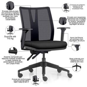 Color: PretoPreto | ColorFamily: Preto | ColorSimple: Preto | ColorSupplier: PretoPreto | Com apoio de braços: Sim | Com aro para pés: Não | Com rodas: Sim | Cor: PretoPreto | Formato de venda: Kit 2 unidades | Materiais do aro para pés: na | Material: Polímero injetado, espuma injetada, tela dublada vulcanizada, rodízios em PU, revestimento em Crepe | Material do estofamento: Espuma Injetada | MaterialFamily: Polímero | Model: Flow Diretor | Modelo: Flow Diretor | Modelo detalhado: Flow Diretor | OriginCountry: Brasil | OriginState: PR | ProductContents: 02 Cadeiras de Escritório | ProductHeight: 81 cm | ProductInstructions: Produto para uso em ambiente interno, nao devendo ficar exposto ao sol, calor e umidade excessivos. | ProductLength: 71 cm | ProductWarranty: 90 dias após o recebimento do produto | ProductWeight: 13 kg | ProductWidth: 71 cm | Requer montagem: Sim | SizeDescription: Altura: 81 cm x Largura: 71 cm x Profundidade: 71 cm | SupplierSimpleName: Kit 2 Cadeiras de Escritório Giratória Diretor Flow F02 Base Preta Crepe Preto - Lyam Decor | Tipo de cadeira de escritório: Diretor Giratória