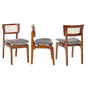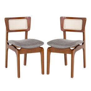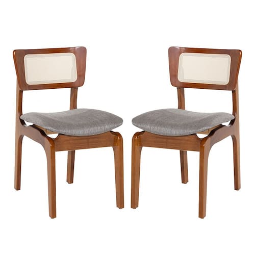 CARACTERÍSTICAS TÉCNICAS: - Produzido em Madeira Maciça Sustentável - Acabamento em Verniz na cor Imbuia - Encosto com Revestimento em Rattan com Fibra Sintética Quadriculada na cor Bege - Assento Estofado Preenchido com Espuma D23 - Assento com Revestimento em Linho Cinza L55 - Cadeira Entregue Montada *Kit Composto por Duas Cadeiras Portugal