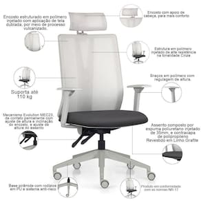 Equipada com um mecanismo Evolution, um sistema de contato permanente, essa cadeira giratória abraça as suas necessidades, permitindo ajustes precisos na altura do assento, do encosto e dos braços. Cada detalhe foi pensado para proporcionar um suporte ideal, respeitando o biotipo do usuário e promovendo uma postura saudável durante longas horas de trabalho. Já a base pirâmide, adornada com rodízios em PU e sistema anti-risco, desliza suavemente sobre qualquer superfície, garantindo movimentos ágeis e seguros. Por fim, o encosto com apoio de cabeça completa a experiência, permitindo que você se concentre no que realmente importa, enquanto sua mente flui livremente.