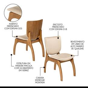Kit de Cadeiras Irlanda é o modelo ideal para completar o seu ambiente. Dispõe de um design atual e versátil que permite montar diversas composições para agregar mais conforto e aconchego. Podem ser utilizadas na mesa de jantar, apoio extra na sala de estar, complementar o ambiente ou aonde você precisar. O destaque fica por conta do encosto ergonômico, dando um toque único a cadeira e deixando ela muito mais confortável. Produzida com madeira maciça, garantindo a sua durabilidade e vida útil. CARACTERISTICAS TÉCNICAS: - Produzida em Madeira Maciça - Acabamento em Verniz na cor Imbuia - Assento Estofado Preenchido com Espuma D23 - Encosto Estofado Preenchido com Espuma D18 - Tecido de Alta Qualidade Linho Bege M58 - Produto Entregue Montado INFORMAÇÕES TÉCNICAS: Altura Total: 86 cm Altura até o Assento: 48 cm Largura Total: 44 cm Largura do Assento: 47 cm Profundidade Total: 67 cm Profundidade do Assento: 44 cm Peso: 12 kg *Kit Composto por DUAS Cadeiras INFORMAÇÕES ADICIONAIS: Garantia para defeitos de fabricação conforme Código de Defesa do Consumidor. *ATENÇÃO: Não nos responsabilizamos pela montagem, subir ou içar o móvel. **As imagens ambientadas são meramente ilustrativas e podem apresentar itens que não compõe o produto, as cores do produto podem variar de acordo com o monitor, a iluminação do ambiente ou sua percepção visual. ***Limpeza: Deve ser feita com pano macio e seco ou levemente umedecido com água e sabão neutro. Não devem ser utilizados abrasivos.