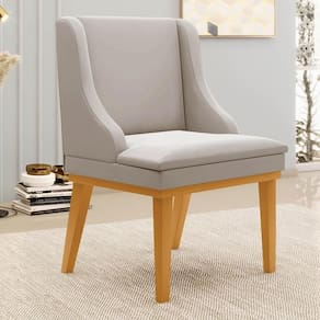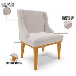 A Cadeira Lia é produzida em Madeira Eucalipto ecologicamente correta e a base fixa de madeira suporta até 120 kg, sem impacto. Seu estofamento é composto por espuma macia densidade D-23 e revestida em Veludo, tecido clássico, elegante, resistente, confortável e de toque macio.