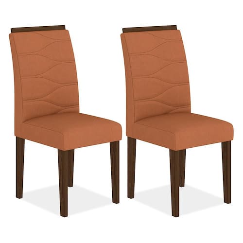Detalhes Técnicos das Cadeiras -Assento e Encosto Tapeçados, Estofados e Fixos -Cadeira suporta até 90KG -Facilidade da Montagem:Média -Tonalidade Cadeira:Imbuia/Suede Terracota -Espuma Assento:D23 -Espuma Encosto:D16 -Pintura UV Texturizada -Material Estrutura:MDF 25mm/18mm -Medida da Cadeira:100CMx44CMx50CM
