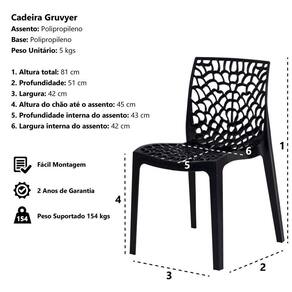 Kit 2 Cadeiras Gruvyer Preta Sala Cozinha Jantar Modelo: Cadeira Gruvyer Preta Assento: Polipropileno Base: Polipropileno Profundidade: 51 cm Largura: 42 cm Altura Total: 81 cm Altura do Chão Até o Assento: 45 cm Profundidade Interna do Assento: 43 cm Largura Interna do Assento: 42 cm Peso Máx. Recomendado: 120 kgs Peso unitário: 5 kgs