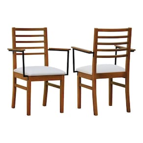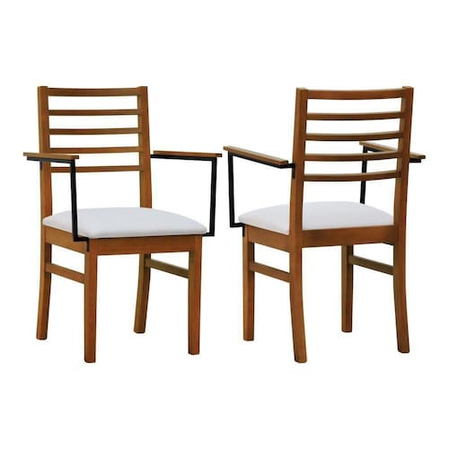 - Materiais: Estrutura em madeira de eucalipto maciço, assento estofado e encosto ripado, braços em aço de carbono com pintura epóxi e madeira tingida na cor amêndoa.