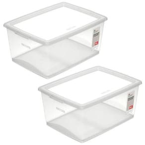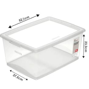 Garantia: 90 dias / Peso total: 1,744kg / Cor predominante: transparente / Referência: 7798139704915; Dimensões de cada caixa: 52,5cm (C) x 37,5cm (L) x 23,5cm (A); Capacidade: 30 litros cada; Conteúdo: 2 caixas organizadoras com tampa; Material: polipropileno; Obs.: o produto possui corpo e tampa transparentes, imagens com outras cores são somente ilustrativas.