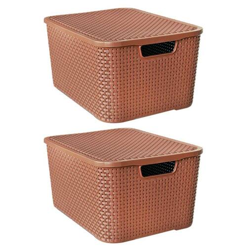 Kit 2 Caixas Organizadoras Rattan Marrom 40 Litros com Tampa 25602 Arqplast Kit 2 Caixas ORGANIZADORas RATTAN com TAMPA 40 MARROM 25602 ARQPLAST Caixa organizadora em plástico com tampa, que facilita a organização de guarda roupas e armários, por ser uma peça charmosa expor em ambientes abertos dá um toque especial a decoração. Combina com vários ambientes, como cozinha, sala, banheiro e quarto. Material - Polipropileno Tamanho - Altura 29 x Largura 34,5 x Comprimento 48,5 cm