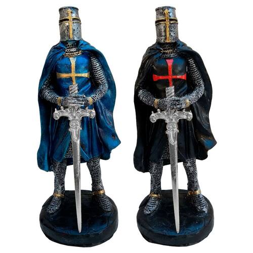 Kit com 2 Cavaleiros Templários Guerreiros Medievais em resina e Espadas em metal, para decoração. Nas cores Azul e Preto. CARACTERÍSTICAS Altura: 23 cm Comprimento: 9 cm Largura: 8,5 cm Peso: 700 g Conteúdo da embalagem: 2 Guerreiros Templarios Medievais Azul e Preto Produto: Em resina de alta qualidade. Por ser um produto semi artesanal, pode haver variação nos tons das cores. Marca: Mahalo Artesanato Ean: 7898878210484