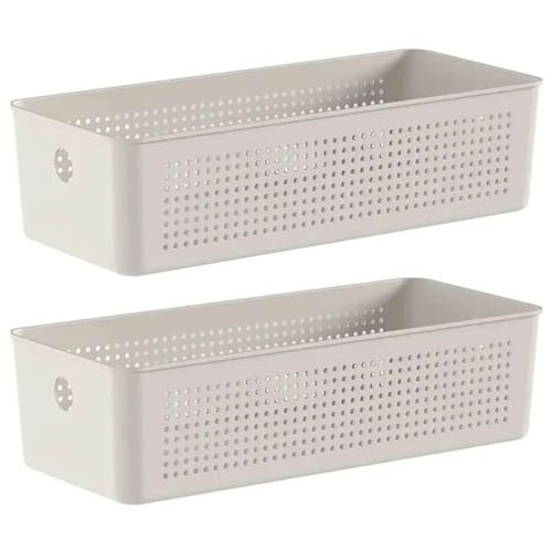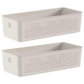 Garantia: 90 dias / Peso total: 340g / Cor predominante: bege / Referência: 7794462613139; Dimensões de cada cesto: 34cm (C) x 15cm (L) x 9cm (A); Conteúdo: 2 cestos organizadores multiuso; Capacidade: 4,5L cada; Material: polipropileno; Obs.: possibilidade de uso com tampa (vendida separadamente).