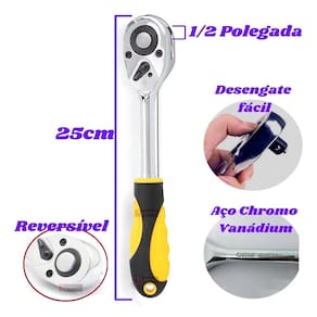 1/2”: comprimento 25 cm, botão de trava/destrava, chave seletora de sentido (aperto/afrouxamento), cabo emborrachado, aço reforçado.