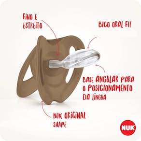 A NUK trabalha todos os dias para tornar seus produtos ainda mais naturais e sustentáveis. A chupeta é livre de BPA. Possui 3 Tamanhos, sendo eles de 0 à 6 Meses, 6+ Meses e 18+ Meses.