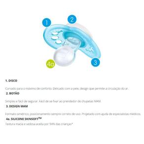 Kit 2 Chupetas - SkinSoft - Flow - 6m - Foquinhas - MAM: Clássicas e Funcionais. As Chupetas MAM foram produzidas com todo o carinho pensando no conforto e bem estar dos bebês. Delicada com a pele e design especial e detalhes que fazem toda a diferença. Seu disco curvado reduz o contato com a pele sem deixar marcas e seus furos de ventilação melhoram a circulação de ar, proporcionando um máximo conforto. Detalhes: • Embalagem dupla: contém 2 (duas) unidades: • Divertidas estampas • Seu disco curvado reduz o contato com a pele sem deixar marcas • Acompanha estojo para esterilização e transporte • Possui furos de ventilação para não irritar a pele sensível • Simples e fácil de segurar. Fácil de se fixar ao prendedor de chupetas MAM • Silicone SkinSoft, macio com superfície texturizada e sedosa • Design MAM: formato simétrico, posicionamento sempre correto de uso • Livre de BPS e BPA Informações: • Produto: Kit Chupetas SkinSoft Foquinhas • Marca: MAM • Coleção: Flow • Tipo: Kit de Chupetas com Estojo de Esterilização • Categoria: Bem-Estar do Bebê • Subcategoria: Chupetas e Acessórios • Tamanho (C x A x L): 4.5 x 5.7 x 04cm • Conteúdo: - 02 chupetas - 01 estojo esterilização • Recomendação: para bebês a partir de 06 meses de idade Especificações: • Modelo: Chupeta MAM Flow 6+ Meses (Embalagem Dupla Neutra) • Referência: CH24323 • Código de Barras: 9001616803710 • Embalagem (C x A x L): 9.5 x 12.5 x 5.5cm • Embalagem (Peso): 0.043 kg • Material / Composição: - Bico: Silicone - Chupeta: Polipropileno • Registro: CE-PUR/IQB 000265 NBR 10334 - OCP 006 • Certificado: Órgãos Autorizados - OCP´S (Organismos de Certificação de Produtos) Aviso: • As imagens são meramente ilustrativas • Os pesos, tamanhos e medidas são aproximados • As cores e estampas dos produtos podem ter variações • As informações são de responsabilidade do fabricante ou fornecedor