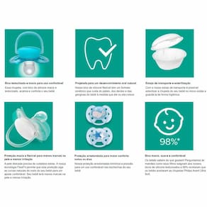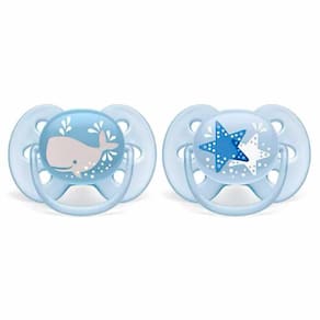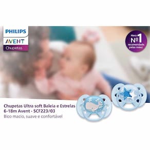 Kit 2 Chupetas - Ultra Soft - 6-18m - Baleia-Estrelas - Philips Avent: Cuide da pele sensível com a chupeta Philips Avent Ultra Soft. A proteção flexível e super macia segue o formato das bochechas do bebê, deixando menos marcas e causando menos irritação na pele para um relaxamento mais confortável. A chupeta mais macia para a pele delicada do seu bebê. Detalhes: • A chupeta mais macia para a pele delicada do seu bebê • Cuide da pele delicada do bebê com a chupeta Philips Avent Ultra Soft. A proteção flexível e extremamente macia segue o formato das bochechas do bebê, deixando menos marcas e causando menos irritação na pele, para um relaxamento mais confortável. • Proteção macia e flexível para menos marcas na pele e menos irritação • Proteção arredondada para maior conforto todos os dias • 98% dos bebês aceitam bicos de silicone texturizados Ultra Soft • Bico texturizado e macio para uso confortável • Projetada para um desenvolvimento oral natural • A esterilização no micro-ondas é segura e fácil • Etapas simples para esterilização confiável em três minutos Informações: • Produto: Chupetas Ultra Soft Baleia/Estrelas • Marca: Philips Avent • Coleção: Ultra Soft • Tipo: Kit Chupetas com Porta Chupeta • Categoria: Bem-Estar do Bebê • Subcategoria: Chupetas e Acessórios • Tamanho: 2 • Conteúdo: - 02 chupetas - 01 transporte/esterilizador • Recomendação: para bebês a partir de 06 a 18 meses de idade Especificações: • Modelo: Kit Chupeta Ultra Soft Dupla Baleia/Estrela • Referência: SCF223/03 • Código de Barras: 8710103938545 • Embalagem (C x A x L): 11 x 12.6 x 05 cm • Embalagem (Peso): 0.046 kg • Material / Composição: 100% silicone • Registro: OCP-0040 • Certificado: Órgãos Autorizados - OCP´S (Organismos de Certificação de Produtos) Aviso: • As imagens são meramente ilustrativas • Os pesos, tamanhos e medidas são aproximados • As cores e estampas dos produtos podem ter variações • As informações são de responsabilidade do fabricante ou fornecedor