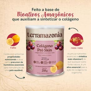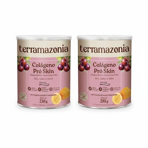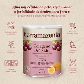 Kit 2 - Destaques - Peptídeos de Colágeno Verisol - Bioativos Amazônicos que auxiliam a sintetizar o colágeno - Fonte de Vitamina C - Fonte de Zinco e Ferro - Sabor natural de Camu-camu cítrico, semelhante ao sabor da Acerola - 30 doses em 210g Descrição O Colágeno Pro Skin é a combinação perfeita de bioativos e nutrientes servindo como um alimento funcional para uma pele mais firme e viçosa, unhas e cabelos mais fortes, melhora da saúde e da qualidade de vida. É fonte de vitamina C, zinco e ferro. O Verisol, que são os Peptídeos de Colágeno, é obtido a partir de uma tecnologia exclusiva alemã, comprovada como o melhor colágeno para pele do mundo. Atua nas células da pele, restaurando a jovialidade de dentro para fora e prevenindo o envelhecimento cutâneo. O Camu-Camu acumula nutrientes essenciais e sintetiza mais vitamina C do que qualquer outra fonte natural, o qual é um ativo essencial para a ação do colágeno no organismo. O Cubiu conta com altíssimas propriedades nutricionais e atua como precursor de hormônios essenciais para manutenção de uma pele saudável. Vitalidade para seu cabelo, pele e unhas: O colágeno é um componente essencial para manter a saúde do cabelo, as unhas e as articulações, além da elasticidade da pele que se perde ao longo do tempo. A principal função deste suplemento é fornecer resistência ao alongamento dos tecidos e colaborar com o correto funcionamento da cartilagem e dos ossos. Por ser um produto natural e sem aditivos químicos, pode haver uma pequena variação de cor, textura e sabor entre um lote e outro. São frutos integrais na composição do produto, portanto há a presença de fibras residuais. Sugestão de consumo Adicione 7g 1 medidor em 200ml de água, suco ou outra bebida de sua preferência. O colágeno pode ser consumido a qualquer momento do dia. Para um melhor resultado sugerimos o uso do produto de forma regular e contínua. Ingredientes Colágeno Verisol, Camu-camu, Cubiu, glicosídeo de esteviol, bisglicinato de zinco, aroma natural de morango, ácido ascórbico, beterraba em pó. Não contém Glúten, Não contém Lactose.