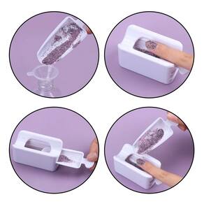 Torne a aplicação de glitter nas unhas mais eficiente. O coletor é um ótimo instrumento para evitar o desperdício de seus produtos, principalmente durante o procedimento no banho de glitter. O pó que cai nas laterais do dedo enquanto é realizado o processo, fica dentro da pá e pode ser utilizado novamente ou descartado. Além disso, aumenta a facilidade de limpeza. Caso o glitter não seja aproveitado, é possível guardá-lo em seu recipiente com a ajuda do funil.