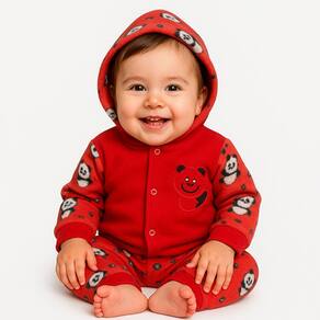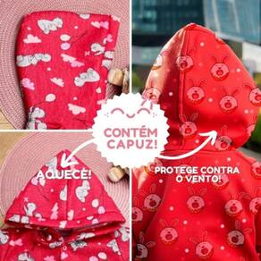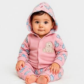O casaco possuí botão de pressão na frente para facilitar a troca, capuz para evitar que o bebê pegue friagem.