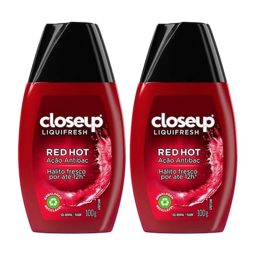 Creme Dental em Gel Close Up Liquifresh Red Hot 100g Closeup Liquifresh proporciona hálito 3x mais fresco. É prático de usar (você nem precisa molhar sua escova de dente) e portátil. Pode ser utilizado como pasta de dente ou enxaguante bucal (sendo aplicado diretamente na boca). Sua fórmula apresenta ingredientes de enxaguante bucal com Active Zinc. Ajuda a eliminar até 99% das bactérias causadoras do mau hálito. Cristais micro-shine que contém os dentes mais brancos. O gel dental Closeup Liquifresh Red Hot proporciona hálito 3x mais fresco. Além disso, é prático (você nem precisa molhar sua escova de dente!) e portátil. Sua permite seu uso tanto como pasta dente quanto enxaguante de consistência bucal (sendo aplicado na escova dente ou diretamente na boca). Sua fórmula apresenta ingredientes enxaguantes bucais com Active Zinc que ajuda a eliminar até 99% das bactérias causadoras do mau hálito. Também contém cristais micro-shine que ajudam a deixar os dentes mais a cada uso. O picante vermelho quente apresenta combinação com notas especiais, proporcionando uma sensação de sabor frio de frescointergreen para homens, proporcionando uma sensação de sabor frio de fresco intergreen. Aprecie a explosão de refrescância do sabor Closeup Liquifresh Red Hot e revele o branco natural do seu sorriso. Hálito fresco e dentes mais brancos para você ter confiança de chegar mais perto. O gel dental Closeup Liquifresh está disponível no tamanho 100g. Experimente também uma outra variedade de creme dental em gel, o Closeup Liquifresh Ice. Ao escovar seus dentes todos os dias após as refeições com creme dental e escova de dentes Closeup, você os protege contra as bactérias e o mau hálito. Estudo in vivo com redução de mau hálito após 4 semanas de uso regular. Marca: Não Informado