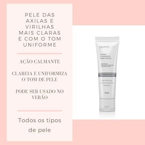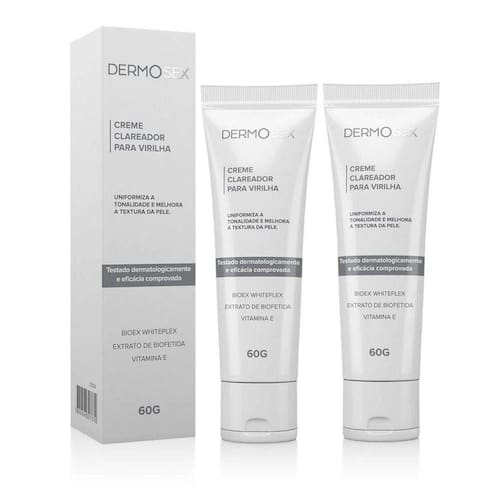 Combo 2x creme para clarear virilha axilas e coxa com mancha escura 60g Creme clareador intimo para virilha dermosex é para uso unissex. Creme para aplicação corporal que clareia e uniformiza o tom da pele, principalmente na área das virilha. De acordo com a anvisa, os dermocosméticos são produtos que em sua composição possui substâncias e ativos terapêuticos que além da epiderme, atingem as camadas mais profundas da pele, garantindo um melhor resultado, como no tratamento anti-idade, manchas na pele e cicatrizes. Ou seja, promove alterações fisiológicas e melhoram a aparência da pele. Os cosméticos tradicionais funcionam com ação instantânea, mas não atuam nas reais causas destes problemas, os dermocosméticos passam por testes e pesquisas científicas garantindo a segurança e eficácia. Pensando nisso, e na crescente busca de produtos para skincare, a a sós não poderia deixar de te apoiar no cuidado e tratamento da pele da sua região íntima. Após muitos testes, chegamos à linha dermosex, revolucionário conceito de cuidados íntimos. Principais benefícios: Ação calmante Clareia e uniformiza o tom de pele Pode ser usado no verão Ativos do produto: Bioex whiteplex Associação de extratos botânicos concentrados em ativos com ação sobre a hiperpigmentação cutânea. Diminui a melanogênese. Extrato de biofoetida O extrato vegetal biofoetida extract com ação inibidora na formação de manchas na pele. Este extrato atua na redução da atividade da enzima tirosinase, auxiliando na redução de tirosina em dopa e dopaquinona, passo inicial para a produção de melanina. Assim com a redução da melanogenese ocorre a uniformização da tonalidade da pele. Vitamina e Conhecida por ser um potente antioxidante, responsável por eliminar os radicais livres - agentes que promovem o envelhecimento da pele - a vitamina e também é capaz de estimular a produção de colágeno, fundamental para manter a firmeza e viçosidade da cútis. Registro anvisa: afe 2.03.200-7 n processo 25351.036147/2020-31 Previne rugas. Melhora a cicatrização. Aumenta a firmeza da pele, já que participa da formação do colágeno. Age como lubrificante e hidratante potente para a pele. Para quais tipos de pele: Todos os tipos de pele Resultado: Pele das axilas e virilhas mais claras e com o tom uniforme Principais tags de pesquisa: Clareador intimo, creme clareador intimo, clareador de partes intimas, clareamento íntimo preço, clareador partes intimas, clareamento região íntima, creme clareador partes intimas, clareador para partes intimas, creme clareador de partes intimas, tratamento para clarear partes intimas, clareador virilha, clarear virilha, clareador de virilha, creme para clarear virilha, creme para clarear virilha, creme clareador de virilha