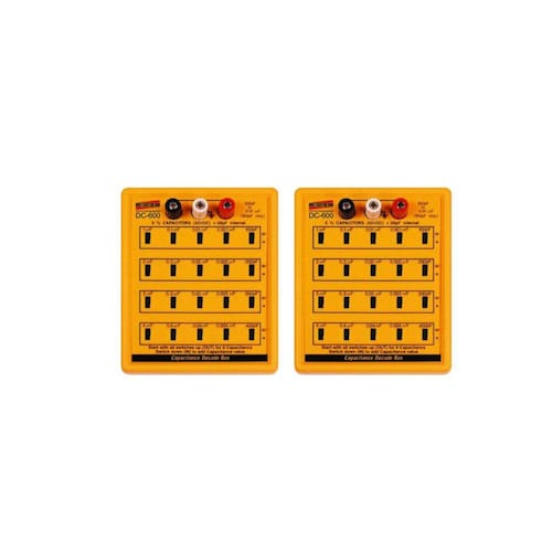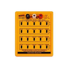 KIT 2 DÉCADA CAPACITIVA MOD. DC-600, FAIXA DE MEDIÇÃO DE 100PF A 11,111?F DESCRIÇÃO: Década capacitiva mod. dc-600, faixa de medição de 100pf a 11,111?f ESPECIFICAÇÕES TÉCNICAS: Escala: 100pF para 11,111mF (100pF por passo) Precisão: Capacitores 5%, utilizado inteiramente. < 1mF, freqüência de teste de 1KHz ³ 1mF, freqüência de teste de 100Hz Limite de tensão: 50V DC, capacitores não-polarizados Capacitância Interna Perdida: Máx. 50pF Alimentação: Nenhuma Temperatura de Operação: 0 a 50ºC (32 a 122ºF) Umidade de Operação: Menor que 80% UR Dimensões / Peso: 147 x 117 x 33mm / 304g. ACESSÓRIOS FORNECIDOS: 2 - Década capacitiva DC-600 Manual de instruções