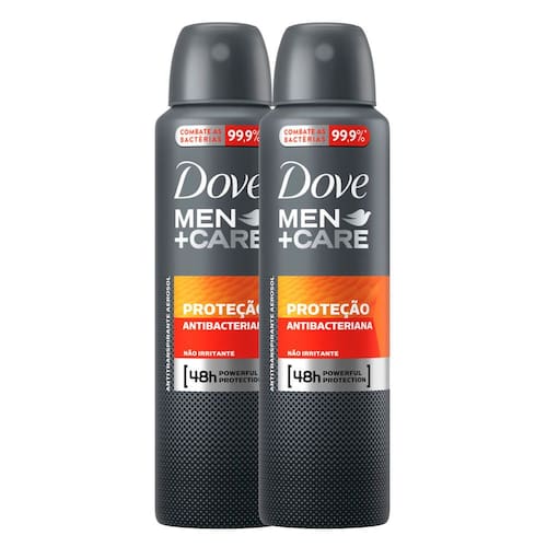 DESODORANTE DOVE MEN + CARE ANTIBAC AEROSOL • Tecnologia Antibac de combate ao mau cheiro e bactérias. • Potente contra o suor, sem irritar sua pele. • Desodorante dermatologicamente testado. • 48 horas de proteção contra odor e suor. • Tecnologia com ¼ de creme hidratante que fortalece a pele contra irritação. • Desodorante sem álcool. Com a exclusiva tecnologia Antibac que combate o mau cheiro, o Antitranspirante Dove Men+Care Aerosol Antibac proporciona proteção de 48 horas contra o suor e contra o mau odor. O que faz de um antitranspirante o aliado perfeito para o dia a dia? Para nós, é a união entre potência e delicadeza. É por isso que a linha de antitranspirantes Dove Men+Care combina uma avançada fórmula, que contém ¼ de creme hidratante, com ingredientes que ajudam a proteger a pele, reduzindo o risco de irritações. Desodorante sem álcool. Disponível em roll-on e aerossol, Dove Men+Care tem o que você precisa para se sentir sempre seguro e com uma agradável sensação de frescor que dura o dia inteiro. Dove Men+Care celebra uma nova definição de força masculina, em que o cuidado com o bem-estar do seu corpo é o centro de tudo. É por isso que Dove oferece a você uma linha completa de produtos, de antitranspirantes a tratamentos para os cabelos, desenvolvida com poderosos ingredientes pensados em cada uma das suas necessidades. O resultado é proteção e cuidado completos e duradouros. Experimente os desodorantes, sabonetes, shampoos, condicionadores e cremes para pentear de Dove Men+Care e conheça um novo jeito de se cuidar. Dove Men+Care celebra uma nova definição de força masculina, em que o cuidado com o bem-estar do seu corpo é o centro de tudo.