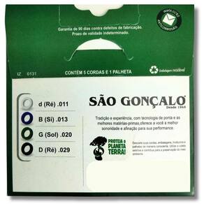 Kit 2 Encordoamento Cavaco Níquel Com bolinha São Gonçalo 0.011 - 0.029 Descrição: As cordas São Gonçalo para cavaquinho possuem um encordoamento em aço inoxidável com bolinha e são revestidas com níquel. Elas possuem uma tensão média, além de possuir uma afinação precisa e durável, o que mantém o sustain por muito mais tempo. As cordas de cavaquinho São Gonçalo são feitas apenas para esse instrumento. Neste caso, é preciso contar com um encordoamento muito leve, para obter um timbre mais aveludado. A São Gonçalo teve a sua história iniciada em 1918, em um modesto edifício na Praça Marechal Deodoro da Fonseca em e, desde então, tem oferecido ao mundo produtos da mais alta qualidade e que garantem o melhor timbre para o seu cavaquinho. Sobre nossa loja: Somos a E Musical loja de instrumentos e acessórios musicais. Contamos com mais de 3 mil produtos novos e seminovos revisados e uma equipe de vendas especializada que trabalha desde 2009 no mercado da música. Estamos sempre à disposição para atender suas necessidades e exigências como músico Emusicalshop Jacareí SP Marca: Não Informado
