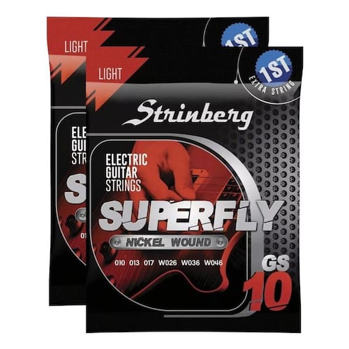 Kit 2 Encordoamento Strinberg Para Guitarra GS10 - 6 CordasO Kit 2 Encordoamentos Strinberg para Guitarra GS10 de 6 cordas é a escolha perfeita para elevar o desempenho da sua guitarra. Com qualidade e durabilidade excepcionais, esses encordoamentos proporcionam um som claro e vibrante, permitindo que você explore todo o potencial do seu instrumento. Seja para tocar acordes encorpados ou solos expressivos, o Kit 2 Encordoamentos Strinberg GS10 garante uma resposta precisa e um tom consistente. Renove o som da sua guitarra e adicione um toque profissional às suas apresentações com esses encordoamentos confiáveis e de alta qualidade.Especificações Técnicas:• Modelo: GS-10• Espessuras: 1º - .010 / 2º - .013 / 3º - .017 / 4º - .026 / 5º - .036 / 6º - .046• Revestimento de bordões: Níquel.Conteúdo da Embalagem:• Kit 2 Encordoamento Strinberg Para Guitarra GS10 - 6 Cordas• Manual e Certificado de GarantiaImportante:• Garantia de 90 Dias.• Valor Kit.