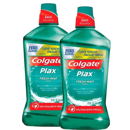 O Kit contém: 2 Enxaguante Bucal Colgate Plax Fresh Mint Leve 1l Pague 700ml cada.
