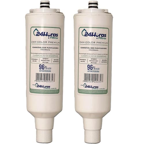 Kit com 2 filtros refil compatíveis com purificadores Colormaq modelos Premium. Troca rápida e fácil. Elimina cloro, gostos, cheiros e partículas sólidas, além de ajudar a elevar o pH. Eficiência na retenção de partículas Classe III, redução de Cloro livre Aprovado, Eficácia Anti-Microbiana 96% Aprovado. Produto em conformidade com a norma ABNT NBT 16098:2012.Tipo