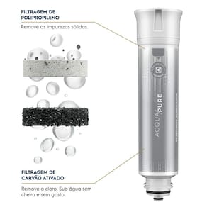 Kit com 2 filtros/refis originais de água Acqua Pure. Tecnologia de filtragem avançada com carvão ativado e íons de prata, retém partículas de 5 a 15 µm. Eficiência na retenção de partículas e redução de cloro livre (mínimo 75%). Controle microbiológico. Filtro de polipropileno meltblown. Vida útil de 3.000L ou 6 meses.Tipo