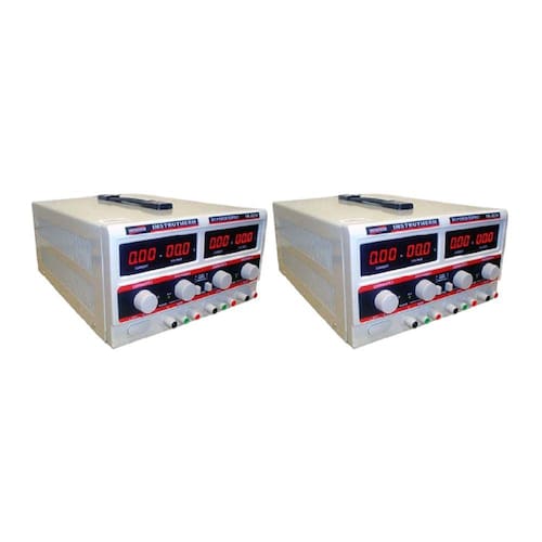 KIT 2 FONTE DE ALIMENTAÇÃO MOD. FA-3030 SIMÉTRICA DIGITAL DE 2 CANAIS, TENSÃO ATÉ 64 VOLTS (MODO SÉRIE), CORRENTE ATÉ 6 AMPÉRES (MODO PARALELO) E 1 SAÍDA FIXA DE 5V/3A   DESCRIÇÃO A fonte de alimentação FA-3030 foi especialmente desenvolvida para pesquisas cientificas, desenvolvimento de produto, laboratório, universidades, faculdades, e eletrônica. A tensão e a corrente dos 2 canais, podem ser reguladas continuamente dentro do valor nominal e o canal fixo possui tensão de 5V/3A. Este instrumento é amplamente utilizado devido a sua alta precisão, durabilidade, e seu circuito de proteção de sobrecarga, curto-circuito e inversão de polaridade, modo de operação em série e paralelo.   DESTAQUES: Modos de operação em série, paralelo, corrente constante, e tensão constante saída fixa de 5V/3A, circuito de proteção contra sobrecarga, curto-circuito e inversão de polaridade, alça para transporte, bornes de saída compatíveis com pinos banana e forquilha, alimentação bivolt (seleção através de chave).   APLICAÇÕES: Pesquisa cientifica, desenvolvimento de produto, laboratório, universidades, faculdades, eletrônica, assistências técnicas, entre outros   De custo acessível, compacto e fácil de transportar é o instrumento ideal para medições de referência acústica tais como comparativo de nível sonoro automotivo, diferenças de níveis entre exterior e interior para estudo de isolação acústica de estúdios, auditórios e também referência para isolação acústica de igrejas, boates, instalações de som profissionais. Amplamente utilizado em cursos técnicos, escolas e universidades para demonstrar a teoria de medição e estudos baseados no ruído.   ESPECIFICAÇÕES TÉCNICAS: Display: LED de 3 dígitos quádruplo Indicação do método de operação Tensão constante (CV) ou Corrente constante (CC) através de LED Chaves de seleção do modo de operação conjunto (Série, Paralelo ou independente) Modos de operação em conjunto Série ou Paralelo, para duplicação da Tensão ou corrente. Modos de operação Tensão Constante (CV) e Corrente Constante (CC) Método de resfriamento: Ventilação forçada Proteção de entrada: Fusível de vidro Consumo Máximo: 150W Faixa de corrente: 0 a 3A (modo independente) / 0 a 6A (modo paralelo) Precisão: ±2% +2 dígitos Regulação de linha: 0,2% + 2mA Regulação de Carga: ? 0,2% + 3mA (? 3A) ; ? 0,2% + 3mA (> 3A) Ripple e Ruído: ? 3mA rms ? 3A) ; ? 6mA rms (> 3A) Faixa de tensão: 0 a 32V (modo independente) / 0 a 64V (modo série) Precisão: ±1% +2 dígitos Regulação de linha: ? 0,01% + 2mV Regulação de Carga: 0,01% + 3mV (? 3A) ; 0,01% + 3mV (> 3A) Ripple e Ruído: ? 0,5mV rms (? 3A), ? 1,0mV rms (> 3A) Tensão da saída fixa: 5V ± 2,5% Corrente da saída fixa: 3A Regulação de linha: ? 0,02% + 2mV Regulação de Carga: ?0,1% Ripple e Ruído: 0,5mV rms   ACESSÓRIOS FORNECIDOS: 2 - Fonte de alimentação FA-3030 4 - Pares de cabos pino banana/jacaré 2 - Cabo de alimentação Manual de instruções