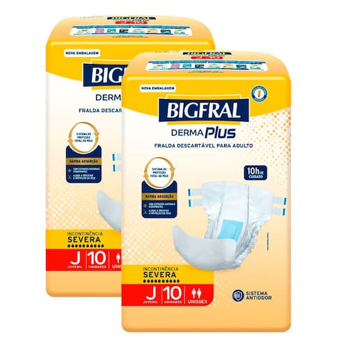 Rápida absorção Evitando que a umidade fique em contato com a pele por períodos prolongados. Extratos naturais hidratantes Exclusiva formula com extratos naturais que mantém a pele hidratada. Ajuda a prevenir irritações Desenvolvida especialmente para ajudar a prevenir irritações na pele. Barreiras antivazamento Proporciona proteção extra contra vazamentos, garantindo sensação de conforto e segurança. Sistema antiodor Sistema que neutraliza o odor da urina, contribuindo para seu bem-estar. A Bigfral DermaPlus foi desenvolvida para adultos com incontinência urinária severa. Possui o exclusivo sistema de proteção total da pele, com extratos naturais hidratantes que ajudam a prevenir irritações, mantendo a pele protegida e saudável, além de sistema antiodor, trazendo até 10h de proteção e cuidado. Ean: 7896012880159